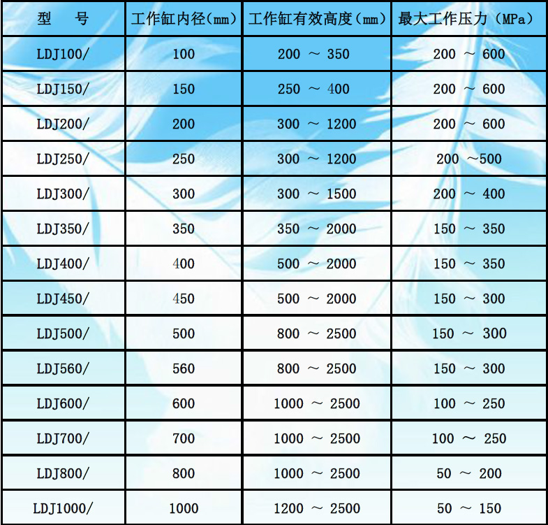 “東龍”冷等靜壓機(jī)系列產(chǎn)品選型范圍表